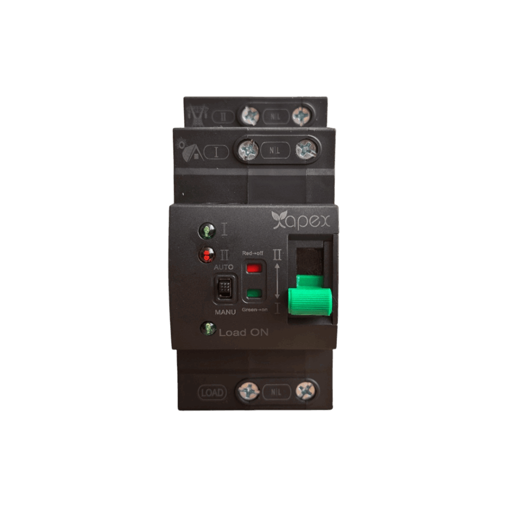 Apex otomatik transfer şalteri (ATS), bir tesiste birden fazla 220V AC güç kaynağı bulunduğunda (ör. inverter, şehir şebekesi veya jeneratör) bu kaynaklar arasında manuel müdahale olmadan otomatik geçiş yapan bir anahtarlama cihazıdır.
